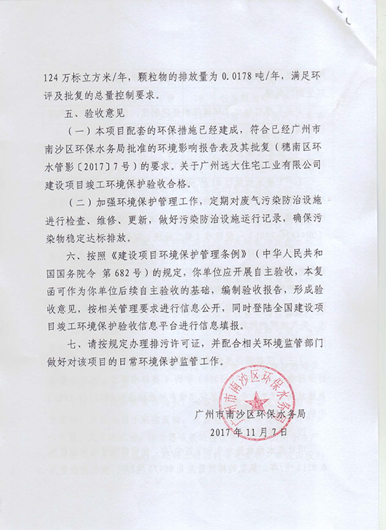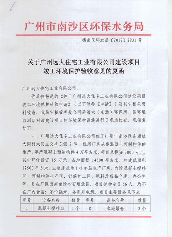 關(guān)于廣州遠(yuǎn)大住宅工業(yè)有限公司建設(shè)項目竣工環(huán)境保護(hù)驗收意見的復(fù)函