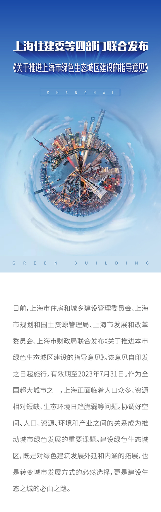 上海住建委等四部門聯合發布 《關于推進上海市綠色生態城區建設的指導意見》