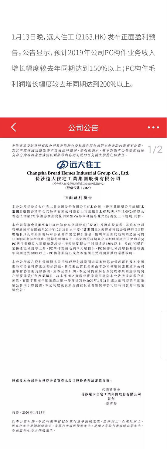 遠大住工盈利預告發布 PC構件業務收入同比增長超150%